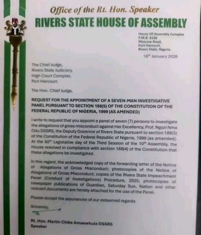 Following the resolution, the Assembly formally called on the Chief Judge of Rivers State to constitute a panel to investigate the claims against both officials, in line with constitutional provisions guiding impeachment procedures.