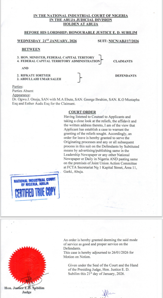 The suit, marked NICN/ABJ/17/2026, was assigned to Justice E. D. Subilim, as the minister accused the unions of paralysing government operations in the nation’s capital.