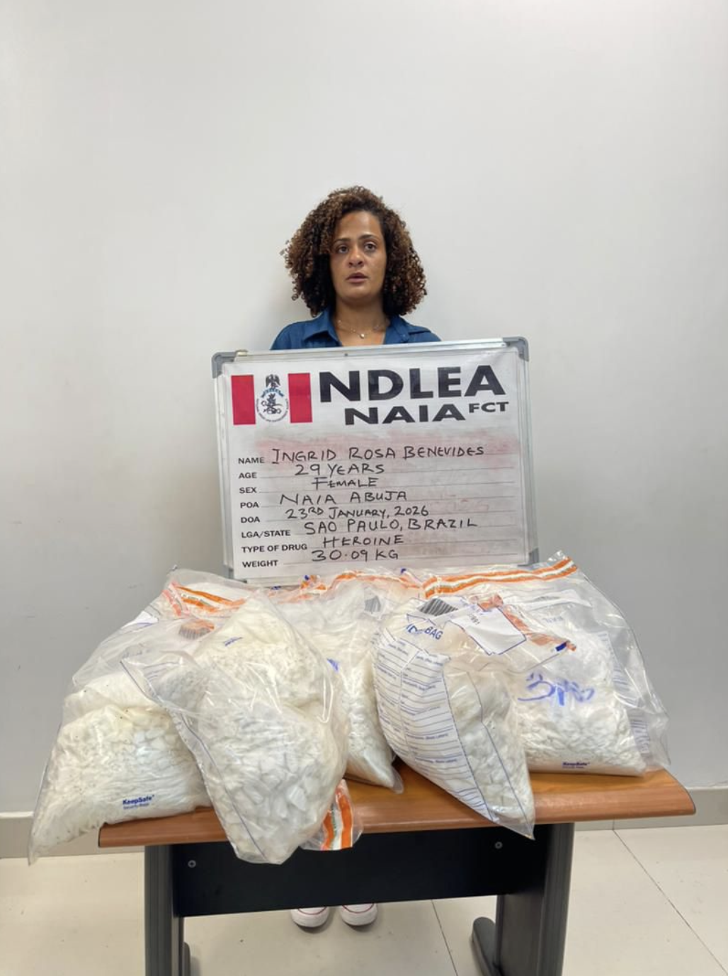 Operatives of the National Drug Law Enforcement Agency (NDLEA) have recorded a major breakthrough in Abuja after arresting a 30-year-old Brazilian woman, Ingrid Rosa Benevides, for allegedly attempting to smuggle 30.09 kilograms of heroin into Nigeria.