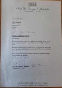 The letter, dated January 26, 2026, and addressed to the Chairman of Ward 1, Labour Party, Uruagu, Nnewi, stated that Moghalu’s resignation takes immediate effect.