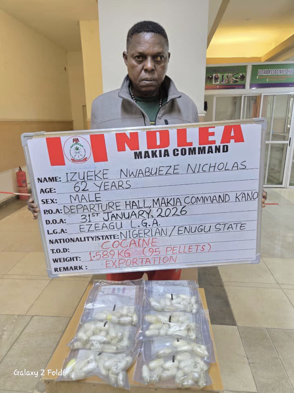 Operatives of the National Drug Law Enforcement Agency have arrested a 62-year-old Lagos-based businessman, Nwabueze Nicholas Izueke, at the Mallam Aminu Kano International Airport for attempting to smuggle cocaine to China.
