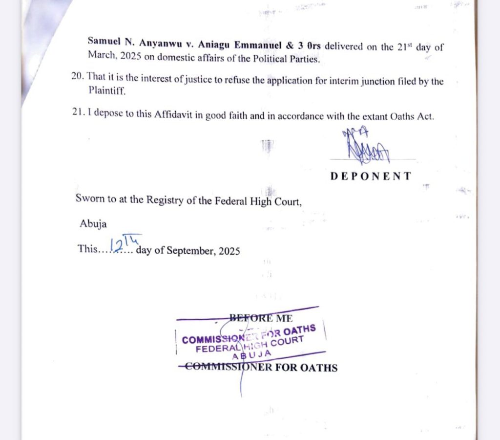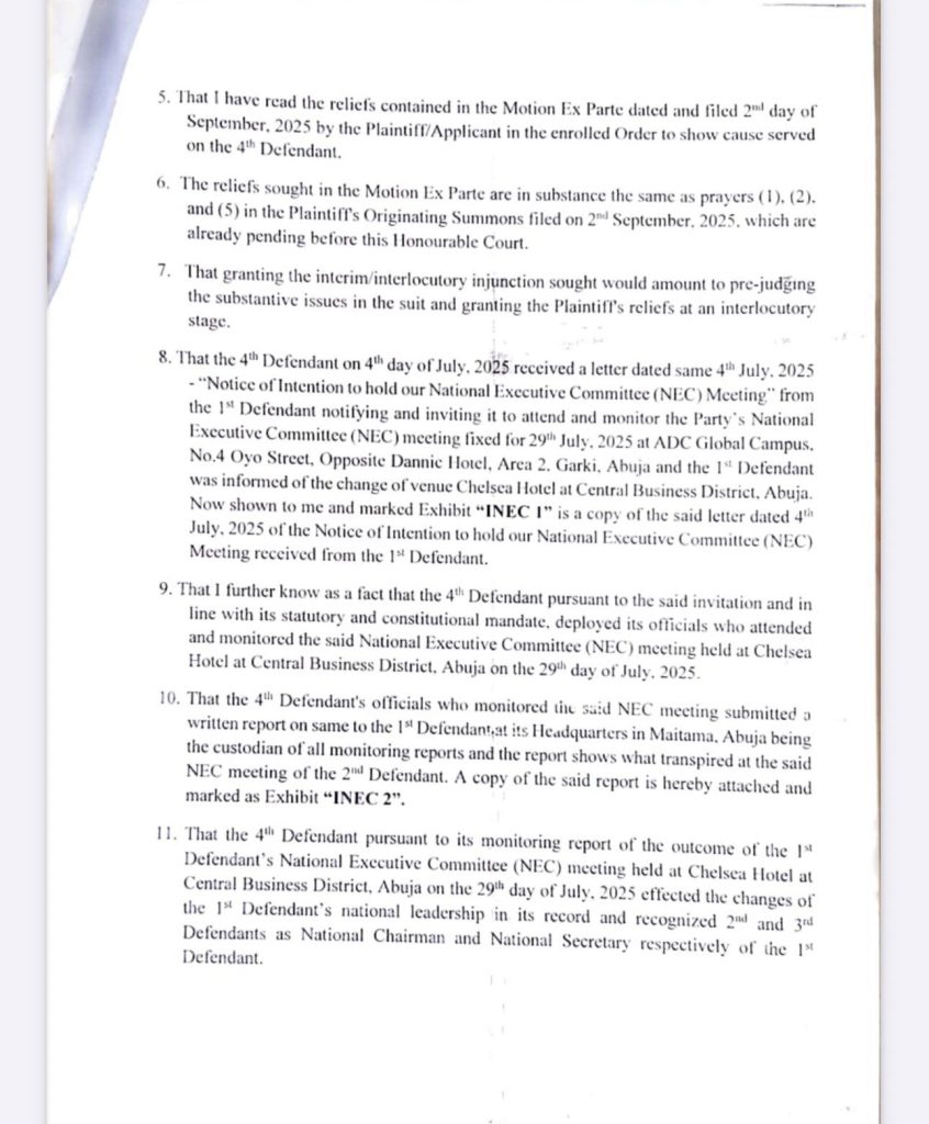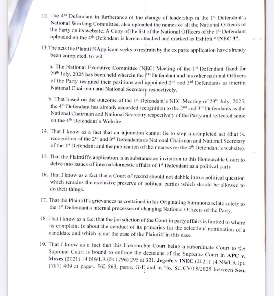 According to the party, Clauses 14 to 19 of the affidavit explicitly state that the process had been finalized and acknowledged by INEC as an internal party matter.