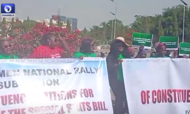 A large group of women on Wednesday gathered at the entrance of the National Assembly, calling on lawmakers to support a bill that seeks to create special seats for women in both state and national legislatures.
