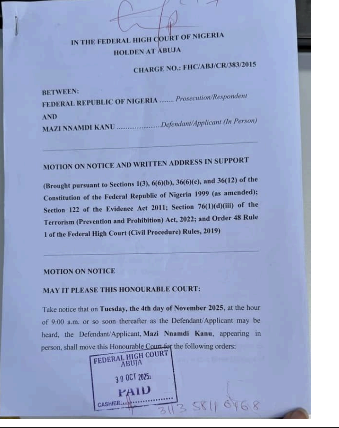 In the new motion titled “Motion on Notice and Written Address in Support” and dated October 30, 2025, Kanu argued that there is “no charge or counts cognisable within the corpus juris of the Federal Republic of Nigeria” against him, describing the charges as “a nullity ab initio for want of any extant legal foundation.”
