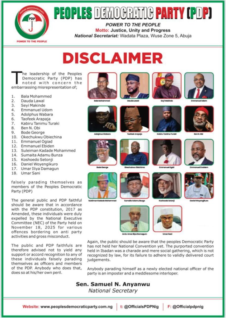 It stressed that members of the public should not engage with or recognise any of the expelled individuals as representatives of the PDP.