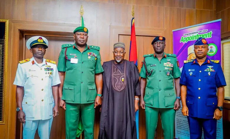 The Minister of Defence, Mohammed Badaru Abubakar, received the newly appointed Chief of Defence Staff and the Service Chiefs during their maiden courtesy visit to his office at the Ministry of Defence, Ship House, Abuja.