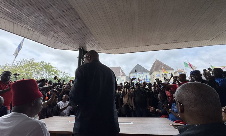 Obi arrived with several politicians and was greeted by a large crowd of traders and youths.