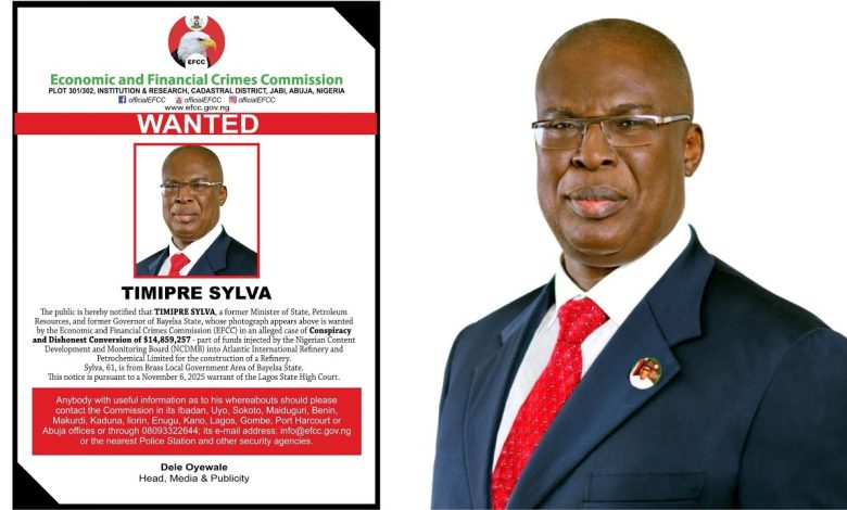 The Economic and Financial Crimes Commission (EFCC) yesterday declared former Minister of State for Petroleum Resources, Chief Timipre Sylva, wanted over alleged involvement in the dishonest conversion of $14,859,257 linked to a refinery project in Bayelsa State.