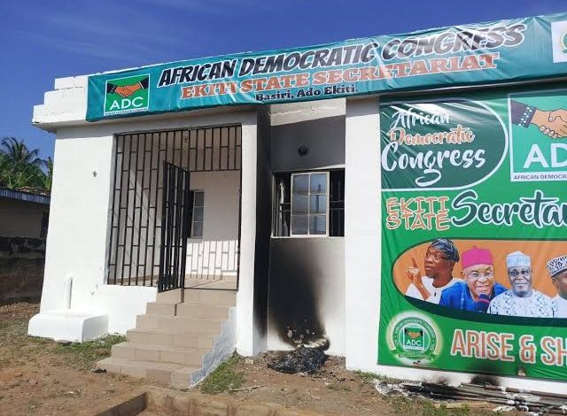 The Secretariat of the African Democratic Congress (ADC) in Ekiti State has been razed by suspected political thugs, alleged to be from the All Progressive Congress APC.